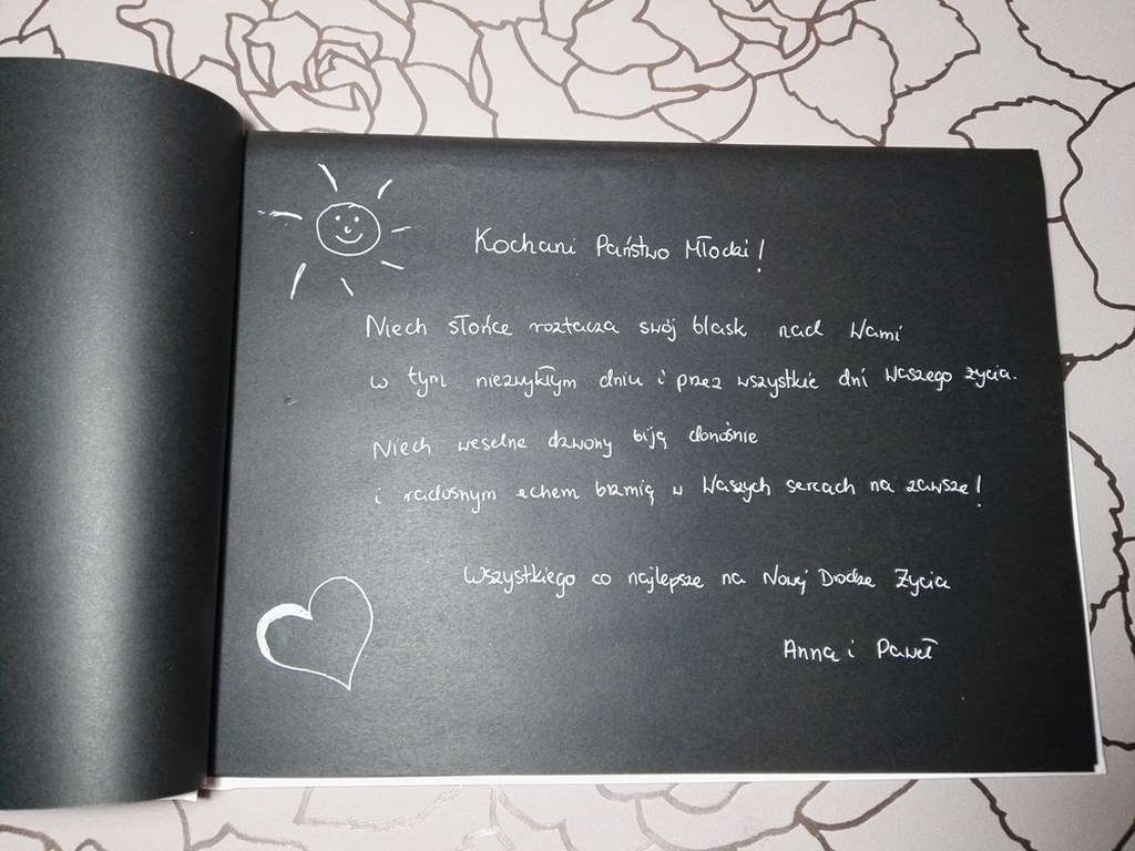 Z pewnością nie będziecie żałować takiego wydatku weselnego! Ostatnio bardzo popularne są pamiątkowe księgi gości, gdzie uczestnicy wesela wpisują swoje życzenia (by juditk) przykładowe teksty do księgi gości: Prosimy o wpisy gości przemiłych! Wejdź i znajdź to, czego szukasz! Nietypowa księga gości weselnych jest idealnym sposobem na to, aby wracać do tego jakże ważnego dla was momentu, czytając serdeczne życzenia od bliskich, którzy razem z wami przeżywali wasz wielki dzień. Więc religijne życzenia na wesele będą ładnym uzupełnieniem do świętych obietnic nowego małżeństwa. Na pocieszenie powiem, że życzeń pod kościołem czy usc często młodzi pod wpływem emocji nie pamiętają. Życzenia do księgi gości wystawionej na weselu dla pary młodej. W księdze ślubnej złóż życzenia, tak, byśmy mieli piękne wspomnienia. Warto jednak nieco je zmodyfikować pod waszą parę młodą. Podane w opisie dobrodziejstwa z posiadania księgi na weselu, niech skuszą i was! Otwarta po latach, przywoła wspomnienia nie tylko pięknych chwil, ale też osób, które w tym dniu były razem z wami. W wybraniu kierunku podróży poślubnej czy dać kilka cennych rad na temat małżeństwa oraz tego, jak je pielęgnować.